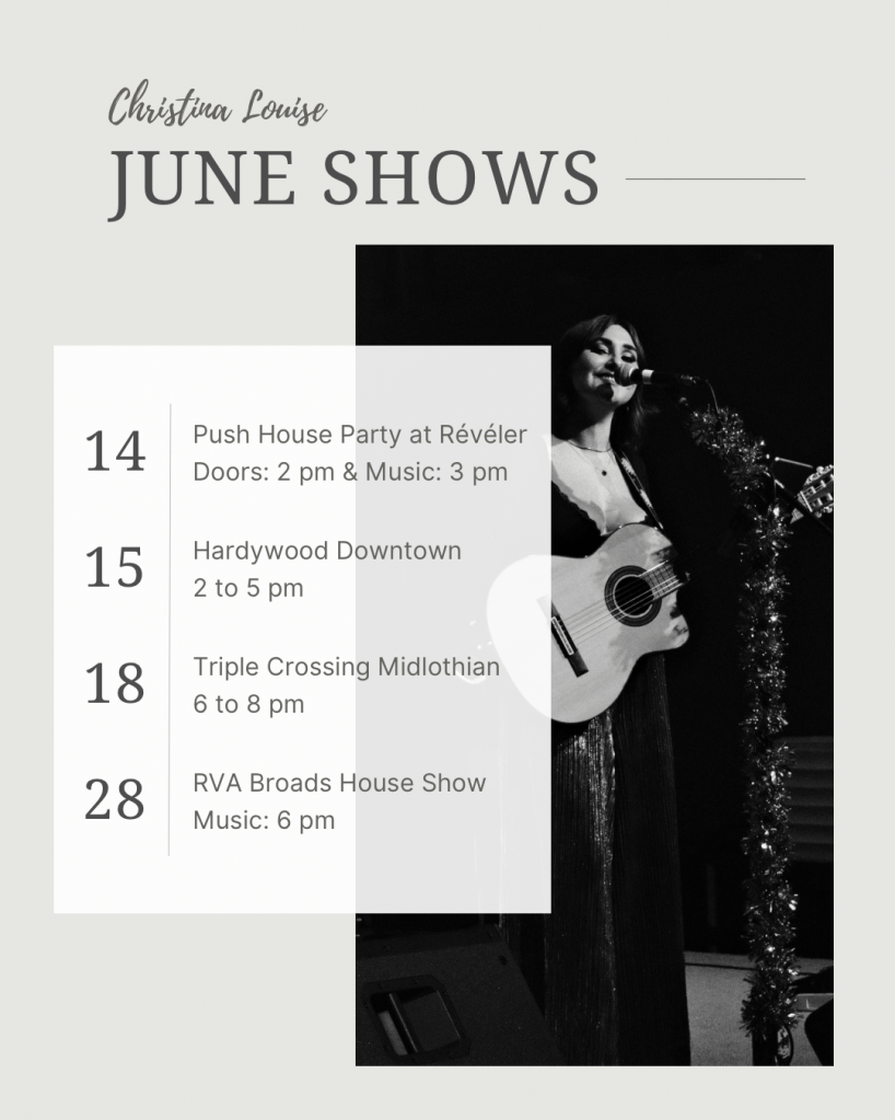 It’ll be my first time performing solo at my favorite venue in Richmond! I’m playing an acoustic set of originals to open up for Natalie Ford, celebrating her EP release as part of the House Party presented by Push House. Limited seating: get tix here!